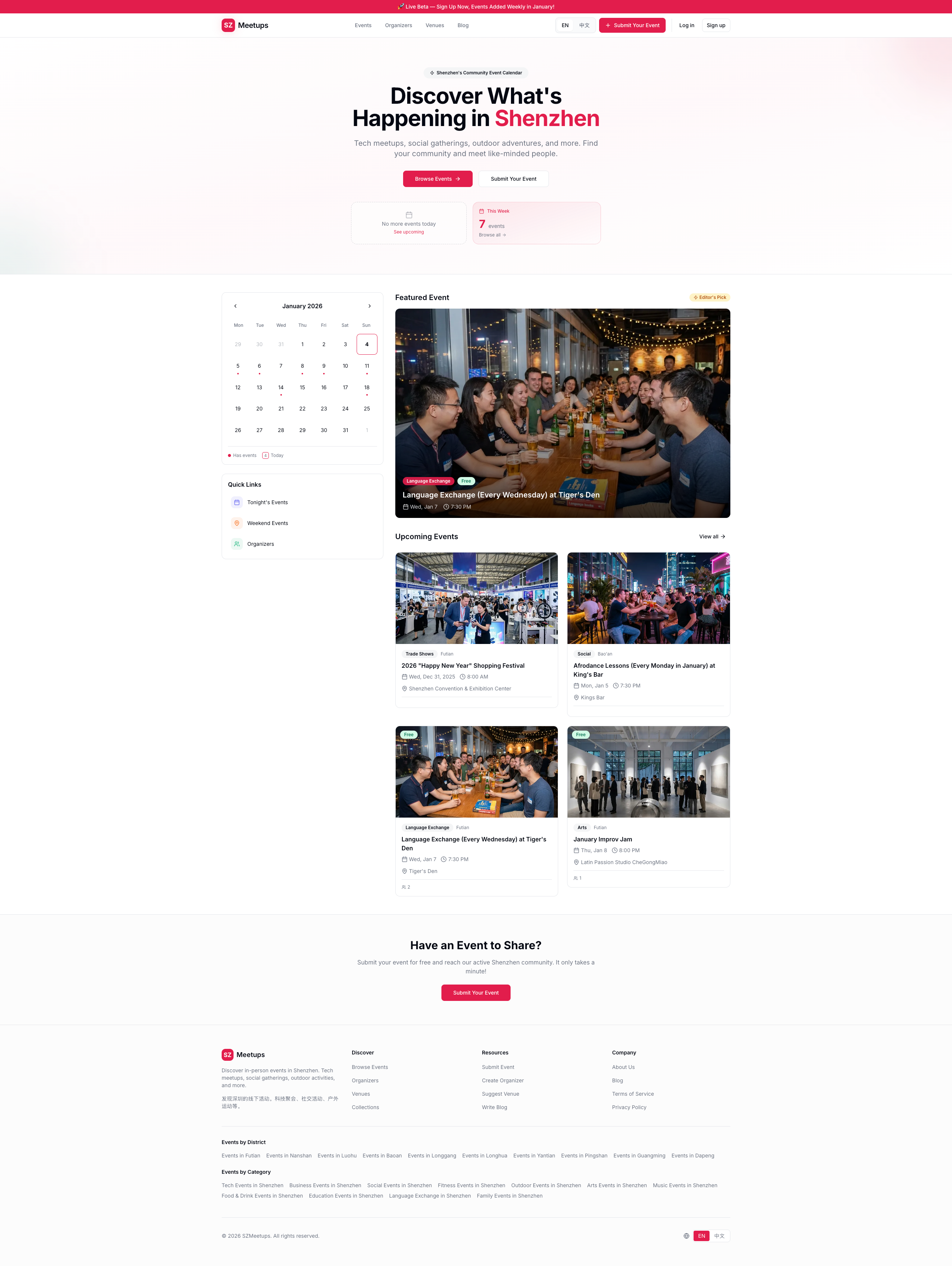 Create a community events platform for Shenzhen, China that serves both English-speaking expats and local Chinese users equally well. The platform needed to handle event discovery, user accounts, organizer profiles, and scale gracefully as the community grows.